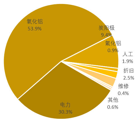 主要成本要素价格分析显示,12月份氧化铝价格、电价均持续上涨,阳极价格小幅回升,电解铝生产中的氧化铝成本占比进一步大幅提升。安泰科测算,以上三项在电解铝制造成本中的比例分别为53.9%、30.3%、9.4%,其中氧化铝占比环比提升1个百分点。