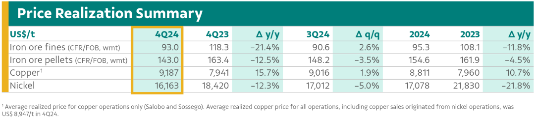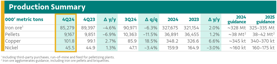 2024年第四季度,铜产量达到10.18万吨,同比增长2700吨,增幅为3%,系受到萨洛博(Salobo)和萨德伯里(Sudbury)运营业绩提升以及沃伊斯湾(Voisey’s Bay)地下矿达产的正面影响。2024年全年公司铜产量同比增加6.6%至34.82万吨,预计2025财年铜产量为34-37万吨。