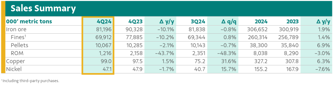 • 2024年第四季度可售铜销量总计9.9万吨,同比增加1500吨,与强劲的产量数据相符。