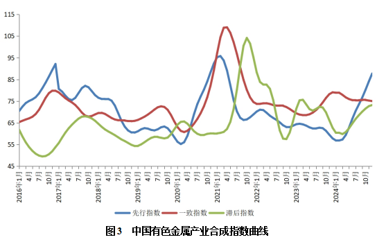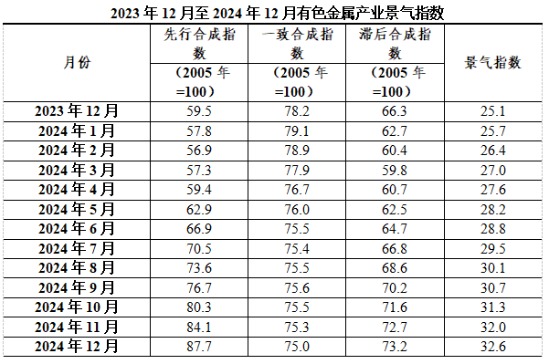 2024年12月,中国有色金属产业景气指数为32.6,较上月上升0.6个点;先行指数87.7,较上月上升3.6个点;一致指数为75.0,较上月回落0.3个点。数据显示,产业景气指数持续回升。