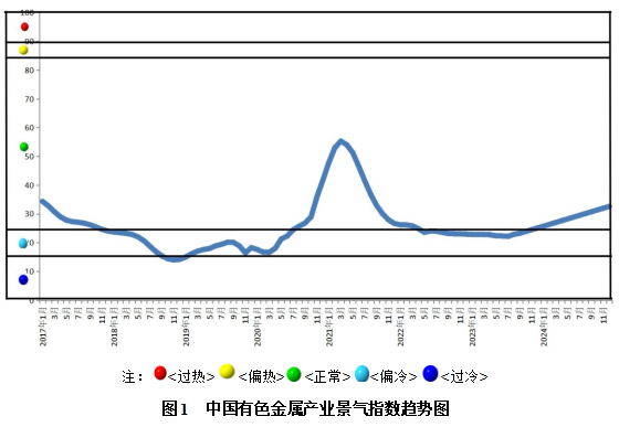 2024年12月份,中国有色金属产业景气指数为32.6,较上月上升0.6个点,总体看,本月景气指数持续上升,但仍处在“正常”区间下部。构成有色金属产业景气指数的12项指标全部处于“正常”区间。