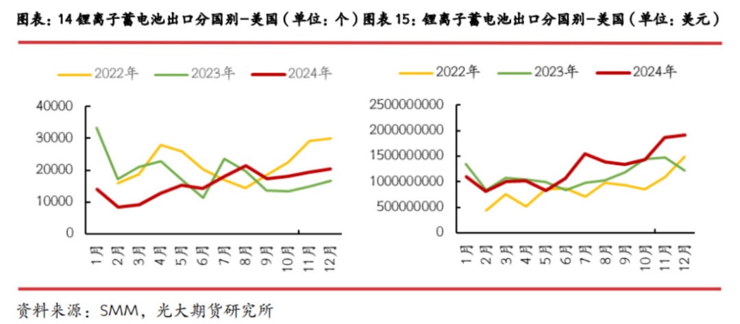 尽管美国里电池厂也在加速投建中,但目前仍然无法满足内需。因此,美国仍部分依赖于从海外进口,中国是其重要来源之一且以储能电池为主。根据Wood Mackenzie2024年5月发布的报告中显示,2023年美国进口的中国锂离子电池中约有83%用于储能领域。此前,美国已经确定于2024年9月27日起执行对中国开展的301关税政策,大幅上调中国产品进口关税,其中对电动汽车加征关税100%,新能源汽车用的动力锂电池加征关税25%;非电动汽车用锂离子电池将于2026年1月1日起征收25%关税。关税政策势必会削弱中国锂电池的价格优势,然而,在2024年四季度期间,中国锂离子电池出口数量逐月增加,贸易额增量明显。全年来看,2024年中国锂电池共计出口至美国153.15亿美金,同比增长13.8%,占总量约25%,较2023年增加4.3pct。