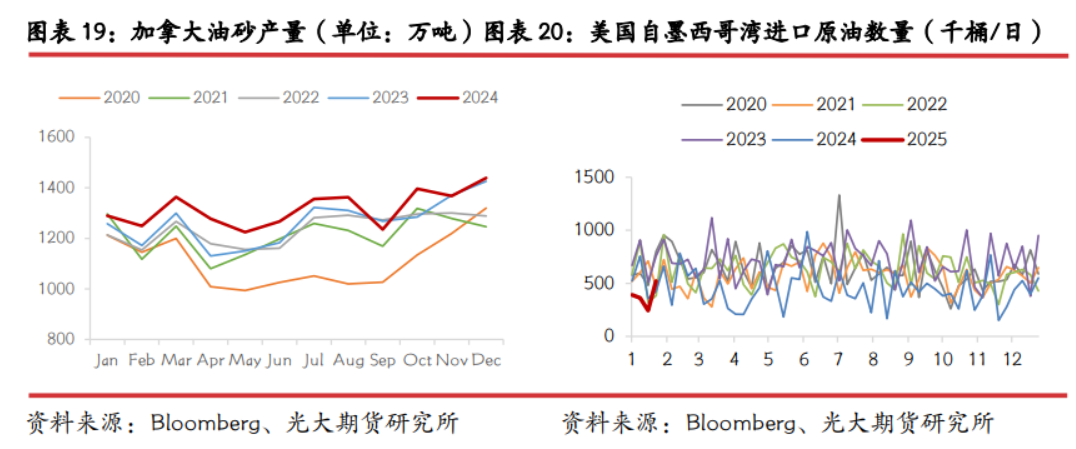 需要注意的是,美国政府本轮的关税政策中同时宣布2月1日起对从加拿大和墨西哥进口的商品加征25%的关税,其中加拿大的能源产品将以10%的税率征收;随后美国政府宣布对加拿大和墨西哥征收关税时间推迟一个月。这也引发了对全球原油供应和贸易流向扰动的担忧。根据美国能源部的数据,加拿大和墨西哥是美国最主要的原油进口来源国,美国进口原油中有近70%来自加拿大、6%来自墨西哥。