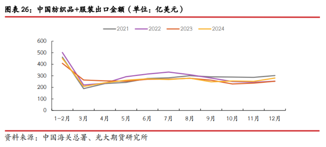 我国纺服出口美国金额自2020年起有明显下降。我国纺织原料及纺织制品出口美国金额当月值周期性波动相对明显,通常在每年的7-8月达到年内峰值,从上图我们可以明显发现,自2020年8月我国纺服产品出口美国达到峰值之后,便逐渐下降。2023、2024年出口美国金额在2021、2022年的水平上再度下降。与之对应的是,纺织原料及纺织制品出口东盟金额在2020年之后有明显增加,我国纺服出口结构已发生较大转变。