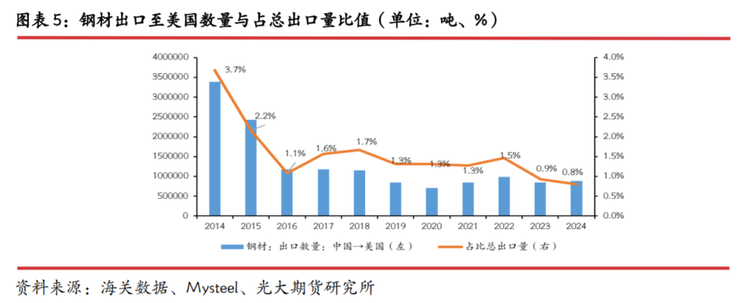 钢铁:近两年,中国钢材出口量持续攀升,2024年钢材出口量达到1.11亿吨,同比增加2046万吨,增长22.7%,为仅略低于2015年的历史次新高水平,钢材出口的大幅增长一定程度上抵消了国内需求下降的影响。但中国直接出口至美国的量占比较小,2024年中国出口至美国钢材量为89万吨,同比增长5.5%,占比钢材出口总量只有0.8%。因此,此次美国加征关税,对钢材直接出口量影响甚微。
