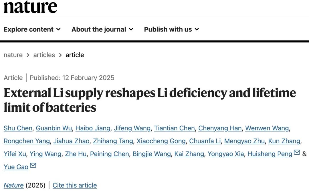 成果以《外部供锂技术突破电池的缺锂困境和寿命界限》(External Li supply reshapes Li-deficiency and lifetime limit of batteries)为题于北京时间2月13日凌晨在《自然》(Nature)上发表。