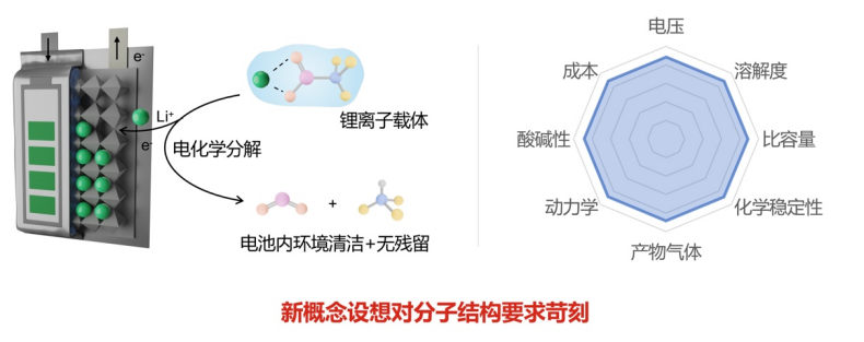 “那为什么不像治病一样,开发变革性分子药物,对电池也进行精准、原位无损的锂离子补充,从而大幅延长它的寿命和服役时间,而不是判定‘死亡’、报废回收?”在没有研究先例支撑的情况下,团队大胆设想——打破电池基础设计原则中锂离子依赖共生于正极材料的理论,设计一种锂载体分子,将其注射进电池,对电池中的锂离子进行单独管控。