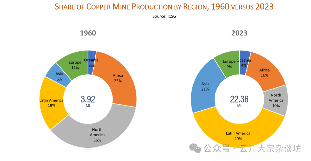 2023年:全球铜矿产量达到2236万吨,拉美占比增至40%,亚洲增长至21%,而北美的份额下降至10%。