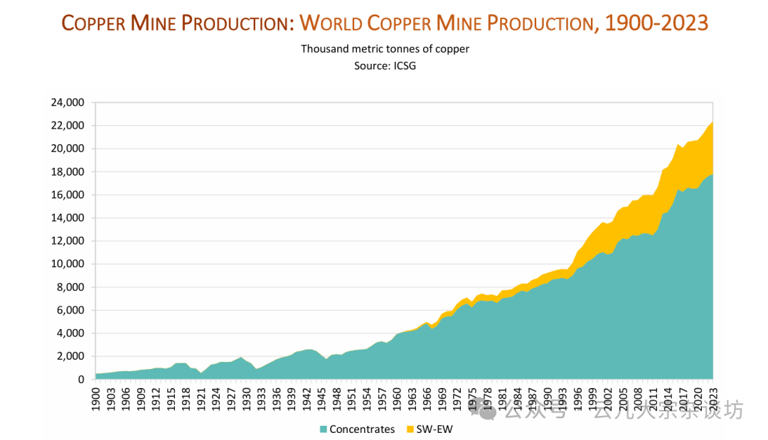 SX-EW(溶剂萃取-电积) 工艺在1960年代之前几乎不存在,但到2023年,其产量已达到460万吨。