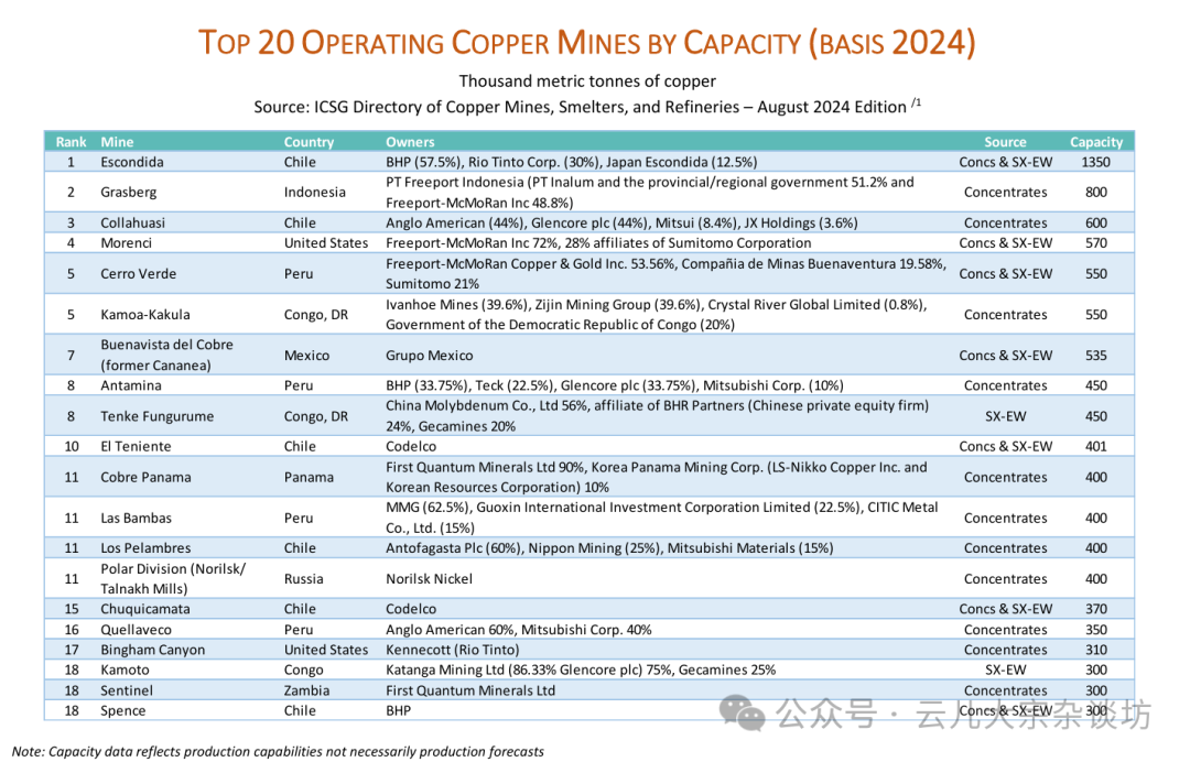 全球前20大铜矿(2024年产能排名)