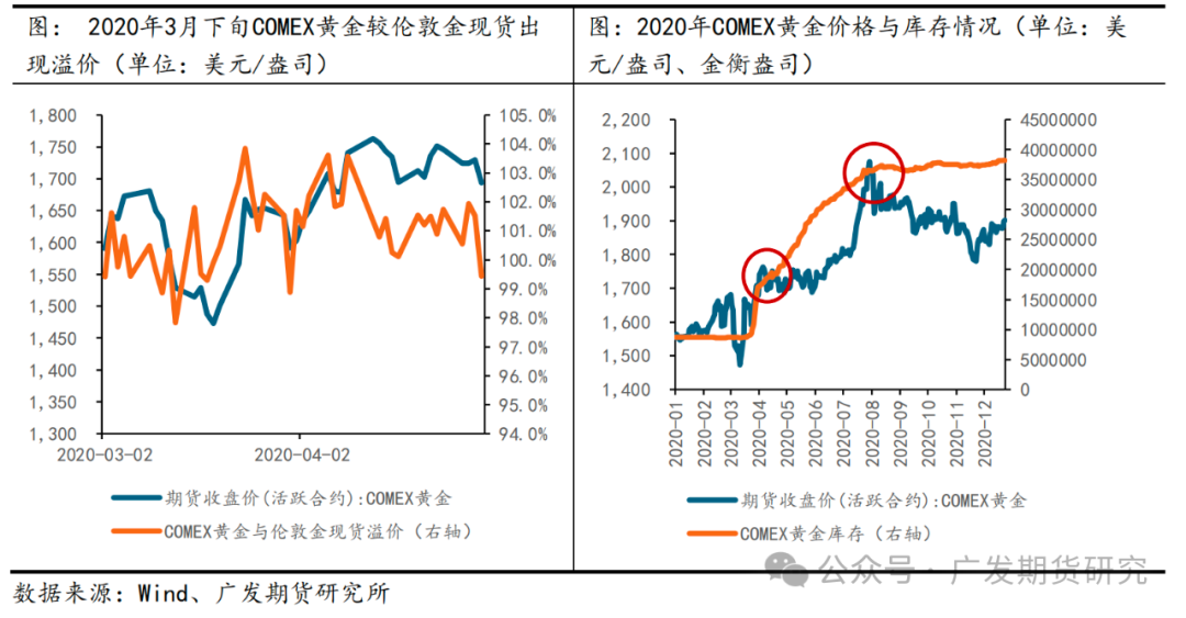 如何在微观层面捕捉关税预期变化?或可参考2020年因疫情导致的供应链断裂担忧,COMEX黄金与伦敦金出现溢价、COMEX黄金持续累库带来的启示。2020年3月下旬开始,由于新冠疫情造成全球多国封城,美国和欧洲之间的航班被迫取消,实物黄金无法在欧美之间正常运输流转,临近交割月份的逼仓压力使得空头持仓的投资者选择提前买入平仓,COMEX黄金较伦敦金现货出现明显溢价。由于市场对疫情扩散及全球供应链断裂的担忧,大量实物黄金转移至COMEX仓库,黄金价格也一路走高,随着累库速度的放缓,黄金价格亦逐渐见顶。本轮COMEX铜与LME铜出现价差、COMEX铜累库源于市场对美国加征进口商品关税的担忧,参考2020年COMEX黄金库存与价格同涨的启示,套利者亦若暂缓运送铜至美国本土,COMEX铜库存或将陆续释放。后续可关注COMEX铜的累库速度,若累库斜率放缓,可能对应COMEX铜关税套利驱动的暂缓。