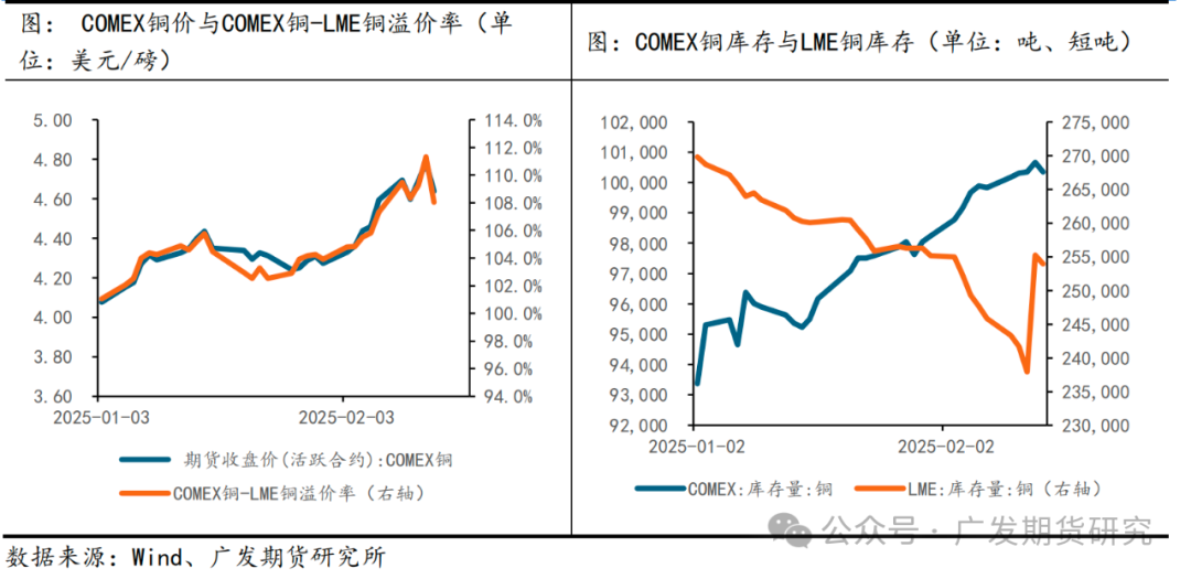 (1)若关税预期持续存在,COMEX铜价或继续维持强势:美国下游需求方为应对关税加征带来的成本上升风险倾向于建立多单套保,多头助推COMEX铜价高涨,而COMEX铜高涨后与海外LME铜形成价差,关税套利驱动套利者在海外买入铜、并运往美国本土,海外市场铜货源偏紧进一步支撑铜价。