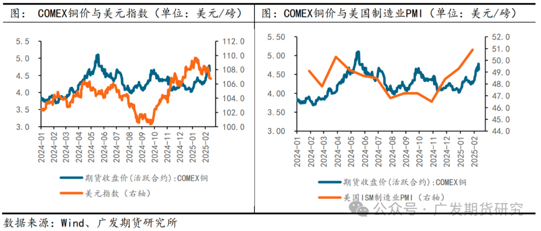 探究本轮COMEX铜价上涨原因,美元指数的回调、美国PMI重回扩张的宏观环境或对铜价形成利好:年初以来,市场对于前期特朗普激进的关税政策担忧有所缓和,美元指数自109小幅回调至107上下,对铜价的压制缓释;2025年1月,美国ISM制造业PMI录得50.90,重回扩张区间,实现连续4个月上行,下游终端制造业的景气复苏亦对铜价形成利好。上述因素虽然利多铜价,但可能都难以解释年初以来COMEX铜与LME铜、SHFE铜的分化性涨幅(1月1日至2月17日,COMEX铜、LME铜和SHFE铜分别实现涨幅14.18%、6.84%、4.42%),尤其是COMEX铜与LME铜之间出现的历史性高位价差。