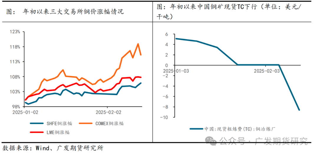 2025年年初以来铜价走强,尤其是COMEX铜在全球商品中涨幅中表现亮眼,最高涨幅于2月13日一度接近20%,并较LME铜出现明显溢价,带动全球铜价上涨。