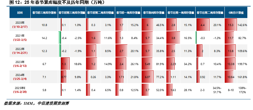 沪锌仍然呈现弱现实与修复预期的博弈:弱现实(利空点)在于:1)冶炼厂原料库存水位偏高,TC尚有企稳向上空间;2)下游开复工进展缓慢,终端建筑工地亦是如此;3)现货成交清淡,贸易商虽有挺价意愿但升水续涨乏力;修复预期(利多点)在于:1)低于历年的锌锭社库水平,节前三周累积至今共计8.32万吨,低于市场普遍预期的11-12万吨;2)上下游企业复工后库存消耗,TC增幅放缓及消费修复预期;3)前期逆有色多头氛围向下计价过度,金属类比价修复预期。预计一季度锌价运行区间23000-25000元/吨,2月中下旬或有反弹机会,可考虑逢低采买锌锭,回调适度布多等待消费回归。