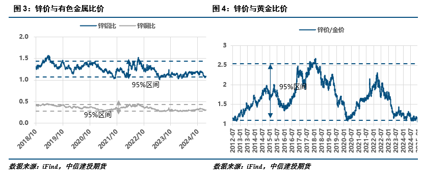 选取与锌需求结构类似的有色金属,以及降息周期中共振同频的黄金等品种价格数据作95%概率分位统计;我们发现在有色金属中锌与铝铜比价处于概率区间下沿,与黄金及大宗商品比价亦是如此。