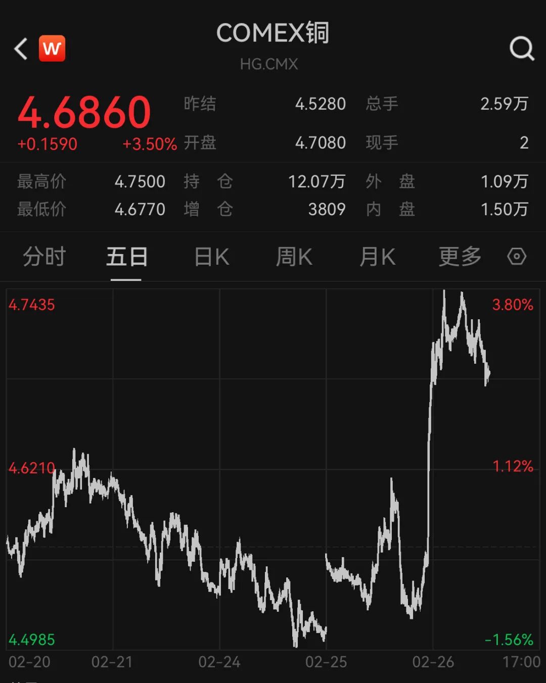 对此,多家期货机构指出,美国当地时间2月25日,美国总统特朗普签署行政命令对铜启动232调查,这可能导致征收铜进口关税,带动COMEX铜价格快速拉升。