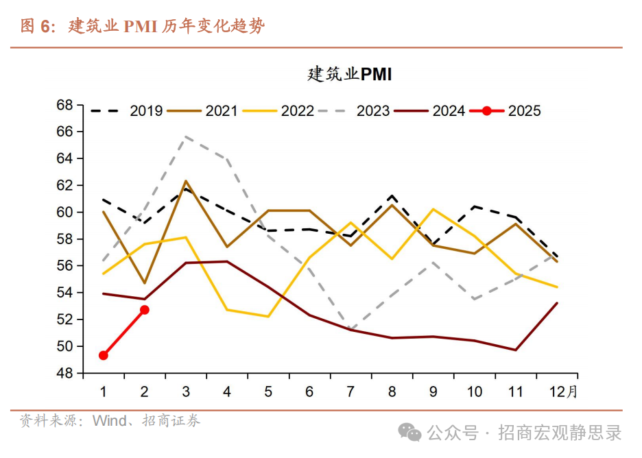 2月建筑业PMI大幅反弹,录得52.7,较上月提升3.4个百分点,结束1月淡季回调行情,重回扩张区间,表明节后建筑企业加速复工,施工活动加速推进,投资相关需求正集中释放。分项指数中,从业人员指数、业务活动预期指数出现下滑,而新订单、投入品、销售价格指数明显回升。其中,新订单指数录得46.8,投入品价格指数录得49.3,销售价格指数录得49.1。业务活动预期指数和从业人员指数分别较上月下滑1.8、3.1个百分点。