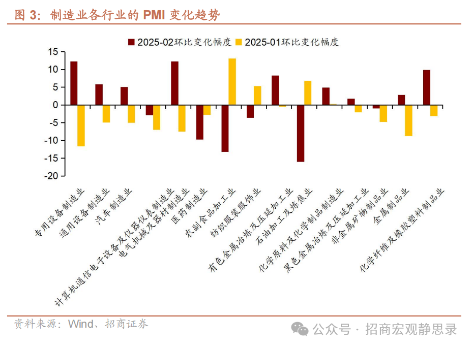 总体而言,中游装备制造、土木工程建筑等行业的率先改善表明这些行业具有更强的内外需支撑,后续景气度有望维持。表现较弱的中下游制造、消费性服务、房地产建筑等行业景气度还有进一步改善空间,复工也仍有较大空间,因此,3-4月PMI仍有后劲。
