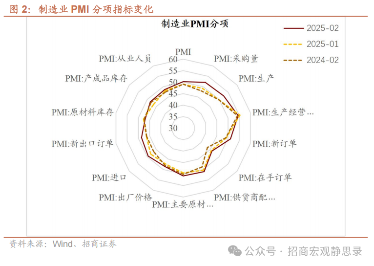 2月制造业PMI环比上行,由于春节错位效应的存在,明显高于2024年同期。分项来看,供给端生产、采购量、进口、产成品库存均明显上行,仅原材料库存指数回落;需求端新订单、新出口订单、在手订单均明显回升;价格方面出厂价格和购进价格同步上行。