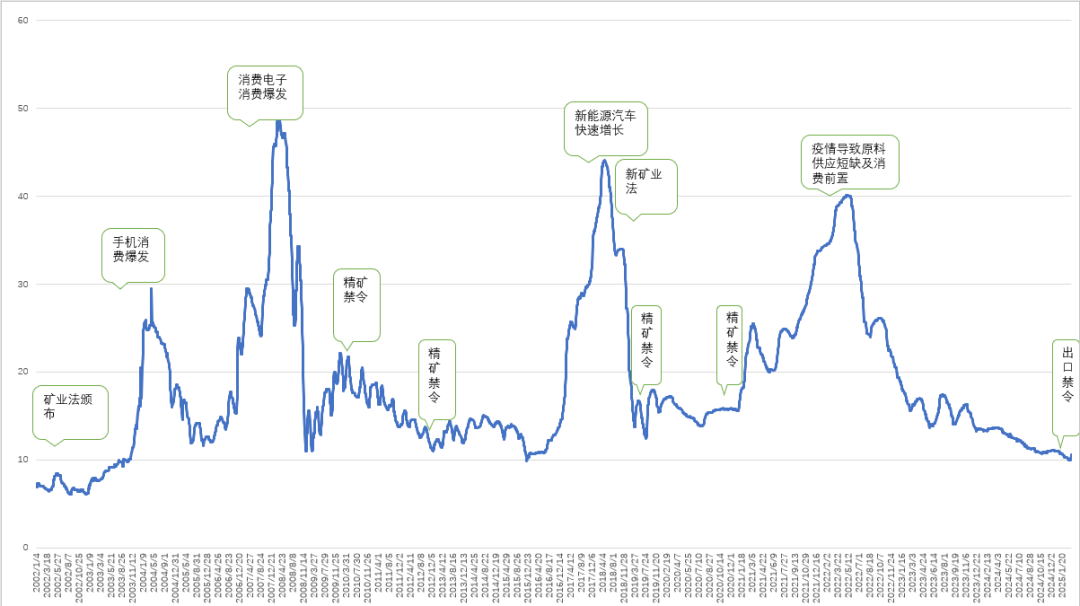 纵观历史钴价,每一次暴涨都是因为新的消费需求出现,原料增速不及消费预期,供需严重失衡所致。刚果(金)每一次出口禁令政策的出台时段都在市场底部,矿业法规频繁调整可以说是一把双刃剑,导致投机性买盘推高价格,提高产品底部成本,但同时也让市场自然修复规律被打破,市场要通过消化政策影响后才能最终回归供需面本身,甚至会让已经开始修复的供需失衡因短期结构性问题而延长底部或回落时间。