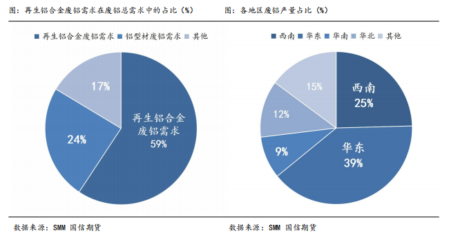 我国整体废铝供应呈现出国产废铝为主,进口废铝为辅的格局,在政策影响下,近年来自给率有所提高,中国有色金属工业协会数据显示,2023 年我国回收的再生铝原料占生产再生铝所需原料的比例达到 77.1%,较2013 年占比增加了9.8个百分点。从地区分布上来看,国内废铝供应主要集中于华东及西南地区,二者占比超过六成。