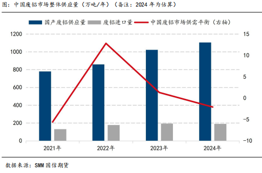 废铝作为再生铝最重要的原材料,是一个成分较为复杂的“大杂烩”概念,其核心内容在于成分和回收率的综合性价比。从来源上,废铝通常分为新废铝和旧废铝两类,新废铝主要指来自下游铝材加工企业和铸造企业生产过程中的工艺废料,或者因性能不合格而报废的产品;而旧废铝指铝制品经过消费后,从社会上回收的废铝与废铝件,例如旧铝门窗、报废的汽车和机械中的铝件,以及废弃电网中的铝导体和铝金属件等,目前我国旧废铝主要回收自建筑及交通运输行业。在我国废铝供应中,60%以上为旧废铝,随着更多废铝逐渐进入回收期,近年来,我国旧废铝供应量持续增长,增速远超新废铝,据SMM数据,2023年中国旧废铝供应量达662万吨,相较于2021年增加40%以上。