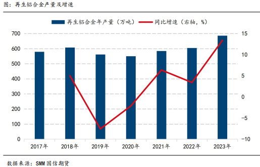 电解铝是传统的高碳排、高能耗行业,在我国设定的电解铝4500万吨产能天花板下,国内的原铝产量具有上限,叠加近年来实现“双碳”目标的提出,共同限制了以原铝为主要原料的原生铝合金的发展,使用废铝作为原料的再生铝概念则得到推崇,一时间,再生铝产能大量增加。根据国家统计局数据显示,2023年,铝合金产量1458.7万吨,同比增长17.8%,铝合金产量持续增长,其中,据SMM数据,再生铝合金年产量自2019年的579万吨上涨至2023年的686万吨,原生铝合金产量增速则明显放缓。