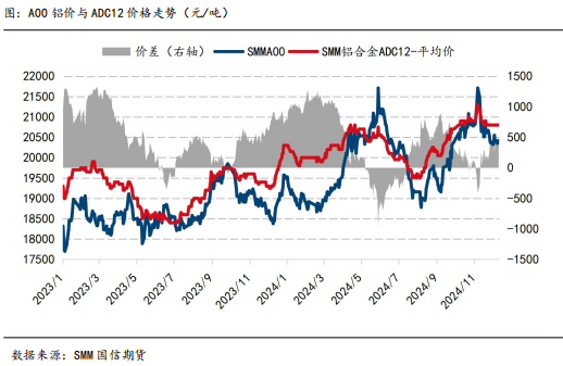 除此之外,ADC12的价格还受到宏观政策的显著影响。从原料端废铝的相关政策来说,2024年10月24日,生态环境部、海关总署等六部门发布《关于规范再生铜及铜合金原料、再生铝及铝合金原料进口管理有关事项的公告》。该公告明确符合标准的再生铸造铝合金原料及再生纯铝原材料不属于固体废物,可自由进口,新增了可进口再生铝的品种,一时间,激起了市场对于未来废铝进口量的增长的预期。但随后,2024年11月15日,《关于规范再生铜及铜合金原料、再生铝及铝合金原料进口管理有关事项的公告》正式落地实施,其中对于新增的三类可进口再生铝品种均征收1.5%进口税,在铝价“外强内弱”的当下,又打消了废铝进口量增加的预期。废铝进口量的变化,将对国内整体废铝供应产生边际影响,从而传导至ADC12的产量和价格。