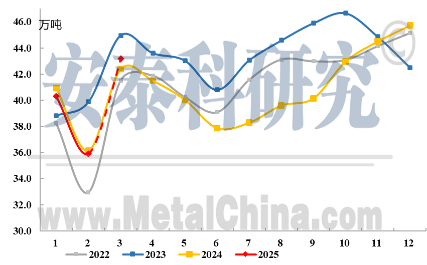 2025年2月份,样本企业生产精铅35.6万吨,同比下降1.5%,环比下降4.7万吨。其中原生铅产量19.8万吨,同比下降3.6%,环比下降1.9万吨;再生铅产量15.8万吨,同比增长1.3%,环比下降2.8万吨,占当月精铅产量的44.4%。修正后,2025年1月精铅产量40.3万吨,同比下降1.6%。