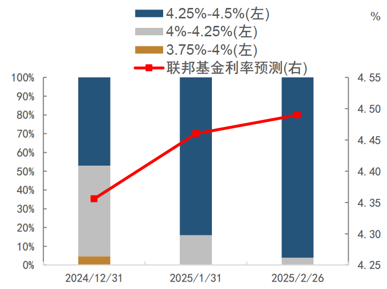 虽然上述政策理论上可以缓解中长期财政压力,但其在实施过程中会加大美国滞胀风险。我们在2025上半年中美债市展望等报告中指出,前述特朗普的政策或将对经济动能带来损害,并明显推升通胀水平。我们认为,加征关税或将在较大程度上被转嫁给美国消费者,在推高物价水平的同时减少消费者的商品需求。压缩财政支出一方面将减少居民的补贴等转移支付性收入,不利于消费;另一方面裁撤政府雇员也会为就业市场带来压力,并影响相应人员的薪资收入。同时,2024年12月中旬美国国会通过的临时支出法案并未如特朗普所希望的那样削减救灾资金和农民援助,并且没有涉及提高美国政府债务上限的部分[6],因此随着今年3月中旬该法案到期,两党需要重新面对债务上限等问题,届时谈判进程或不会一帆风顺,这也会对财政支出形成更多挑战。此外,驱逐非法移民的政策将通过减少劳动力供给的渠道产生供给冲击,进而带来中短期的通胀压力。