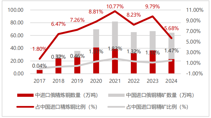 从产量和销量看,基本不受影响。近年来俄罗斯铜精矿产量稳中有升,2017-2024年俄罗斯铜产量年复合增长率为4%。由于俄罗斯铜精矿及精炼铜95%以上都出口至中国、哈萨克斯坦,俄铜销量受西方制裁影响不大。