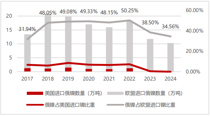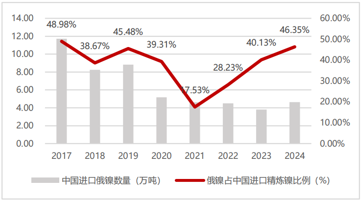 从贸易流向看,亚洲同样超过欧洲成为俄镍销售重心。根据UN Comtrade数据,俄乌战争后,美国从俄罗斯进口镍占比从2022年的7.3%下降至2024年0%,2024年2月,美国全面禁止从俄罗斯进口镍,转而加大从加拿大、墨西哥等国进口。相比之下,欧盟对俄镍进口依赖度更高。俄乌战争前,欧盟从俄罗斯进口镍占比维持在50%左右;俄乌战争后,欧盟虽没有明确禁止俄镍进口,但受美英制裁影响,进口商主动减少俄镍进口,俄镍进口占比从2022年50.25%下降至2024年的34.56%,转而加大从加拿大、美国等国进口。中国、印度等亚洲国家占比提升。俄镍占中国进口精炼镍数量较为稳定,占比逐年提升。