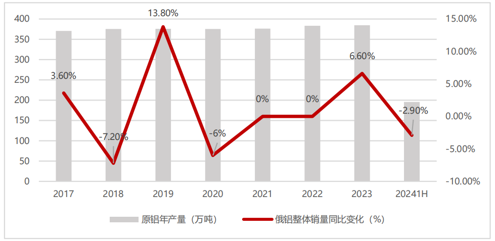 从产量和销量看,产量稳定,销量受制裁影响小幅下降。2018、2024年LME、COMEX两次禁止俄铝交易。据俄铝Rusal年报(持有俄罗斯所有铝产能),近年来产量平稳,销量在2018年、2024年上半年分别下降7.2%/2.9%。俄铝售价也有明显折价,2024年上半年较LME基准价格的平均溢价同比下降20.5%,从每吨200美元降至159美元。