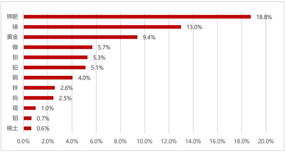 俄罗斯是全球重要的铝、镍、铜和钾肥生产国和出口国,有色金属是俄罗斯仅次于能源的最大出口商品。根据USGS数据,2024年俄罗斯钾肥产量900万吨,占全球总产量18.8%,居全球第二;镍矿产量21万吨,占全球总产量5.7%,居全球第三;原铝产量380万吨,占全球总产量5.3%,居全球第三;铜精矿产量93万吨,占全球总产量4%,居全球第七。