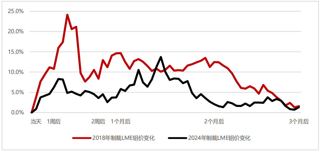 图表17:2018、2024年宣布制裁后LME铝涨跌幅(以制裁发布前一天为基准价格)