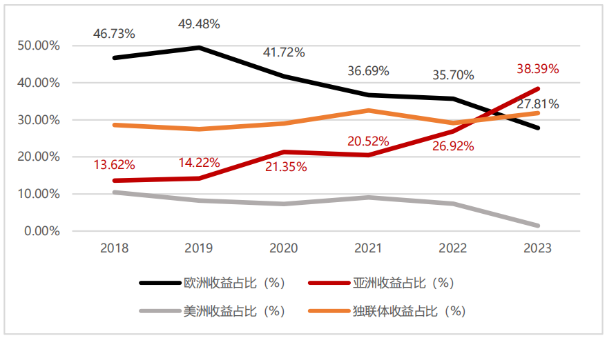 图表4:2023年俄铝主要收益来源从欧洲转为亚洲地区