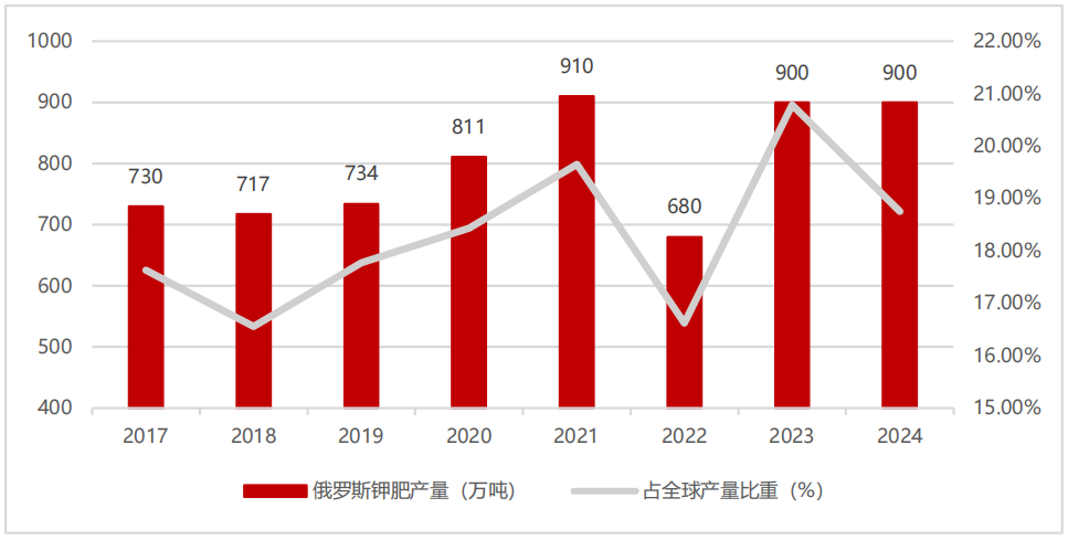 根据USGS数据,2024年,俄罗斯氧化钾储量为9.2亿吨,居世界第三位(仅次于加拿大、老挝),占全球19%,钾肥产量900万吨,居世界第二位。白俄罗斯氧化钾储量7.5亿吨,居世界第四位,占全球16%,钾肥产量700万吨,居世界第三位。