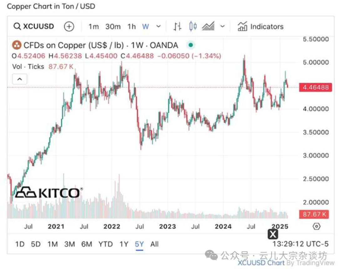 美银(Bank of America)预测,2025年铜价将达10,750美元/吨(4.87美元/磅)。