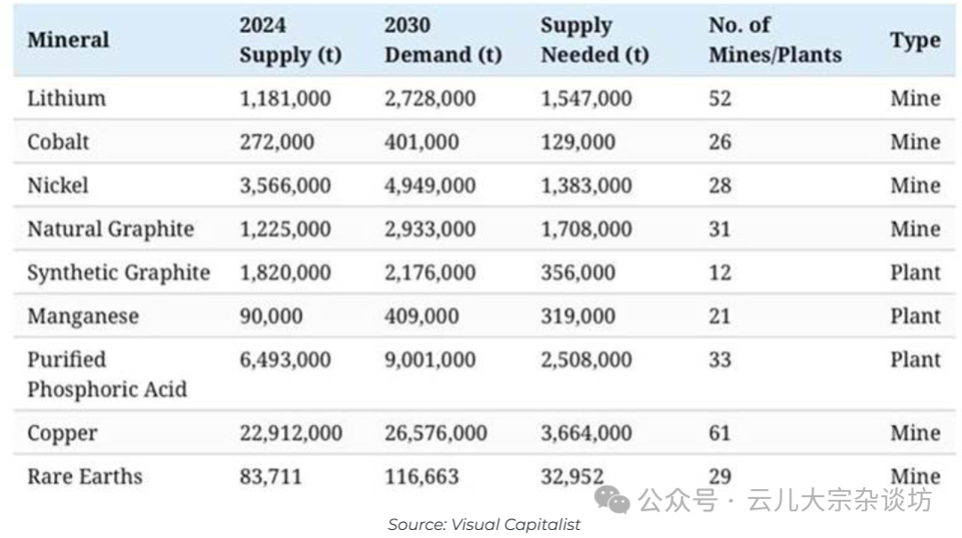 Visual Capitalist 援引 Benchmark Mineral Intelligence 数据指出,要满足2030年全球电池需求,全球需要新增 293 座矿山或工厂。