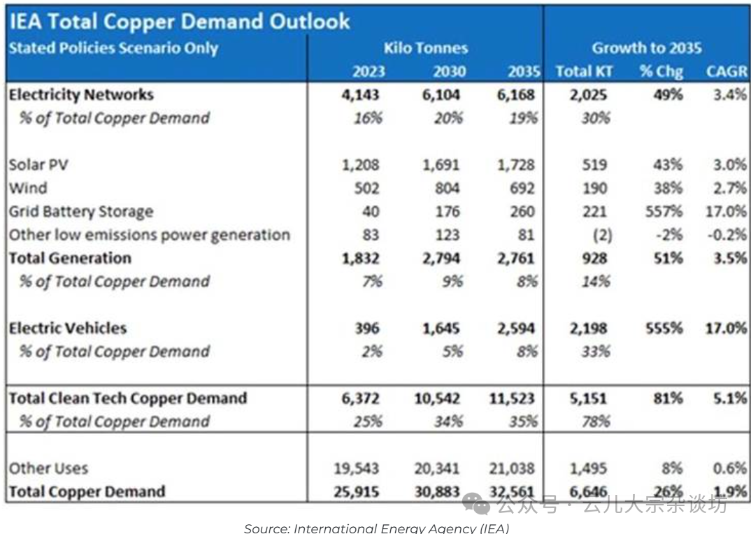 据 国际能源署(IEA) 预测,电网基础设施 对铜的需求将从 2023年的410万吨 增长至 2035年的620万吨,增幅 49%。