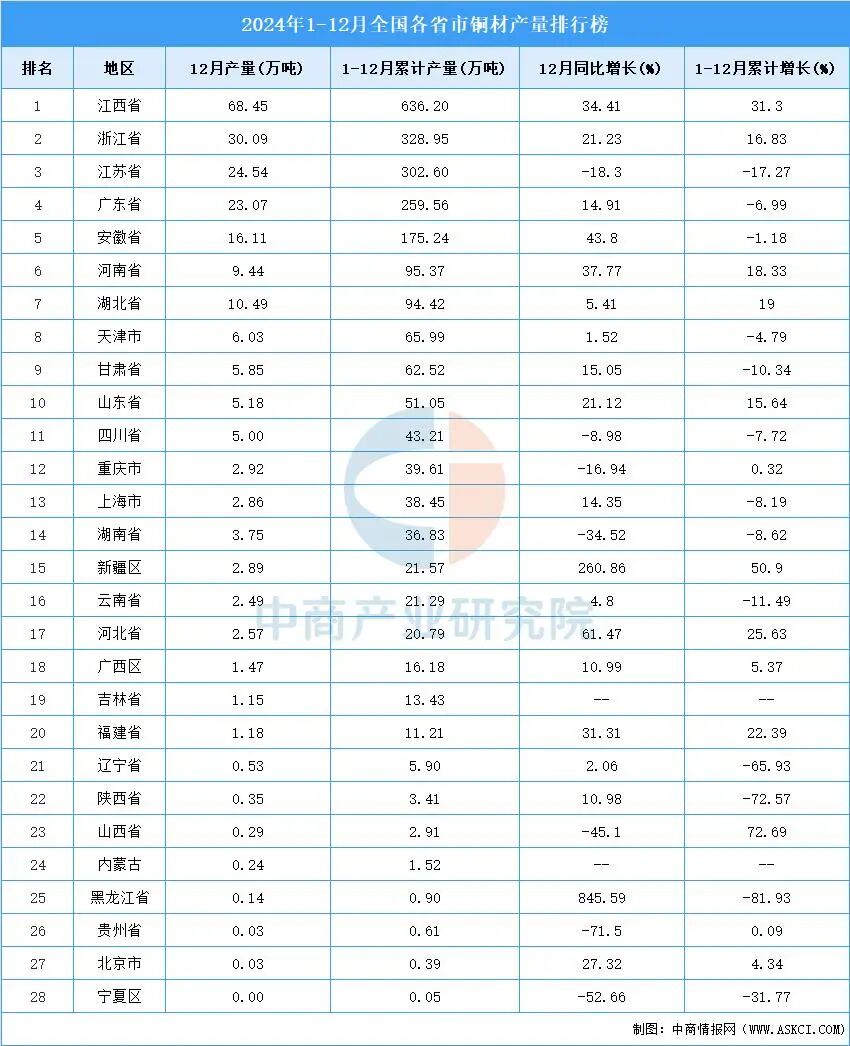 排名第三的是江苏,铜材累计产量302.61万吨。全省以苏州、无锡、常州、张家港等地为核心,形成较为完善的产业集群,涵盖从铜冶炼到铜加工的全产业链。 张家港联合铜业公司是铜陵有色控股企业,成立于1996年,占地面积20万平方米。具备阴极铜年生产能力30万吨,其中常规电解年产20万吨阴极铜,为江苏省最大铜冶炼企业。