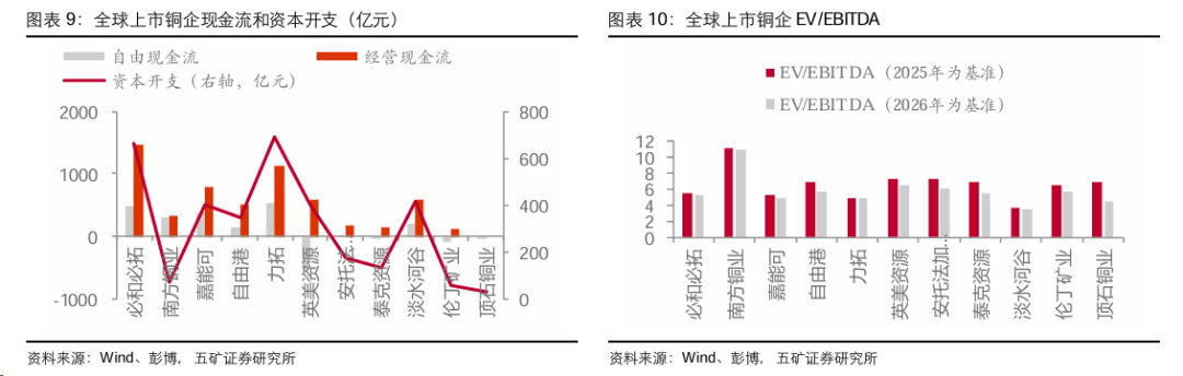 铜营收占比较高的企业,EV/EBITDA估值相对较高。从企业倍数来看,2025年南方铜业的企业倍数最高,达到10x以上;英美资源和安托法加斯塔其次,企业倍数达到7x以上;淡水河谷和力拓企业倍数最低,EV/EBITDA低于5x。