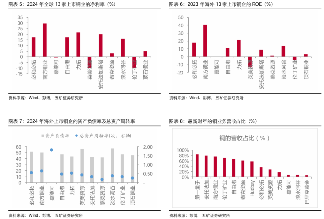 3)权益乘数:2024年大部分海外企业资产负债率均有所降低。2024年海外铜企的平均资产负债率为37.3%,同比下降13.07pcts。其中南方铜业和泰克资源降幅较多,伦丁矿业、安托法加斯塔和英美资源的同比增幅较多。