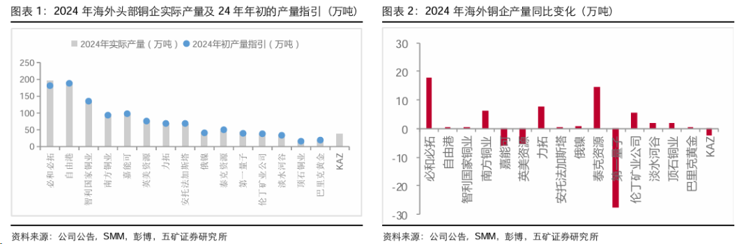 2024年海外头部铜企产量基本满足预期。2024年矿产铜产量合计为1204.3万吨,同比+16.3万吨,同比增速为1.4%。从产量指引兑现度来看,2024年实际合计产量基本和2024年初的产量指引一致。