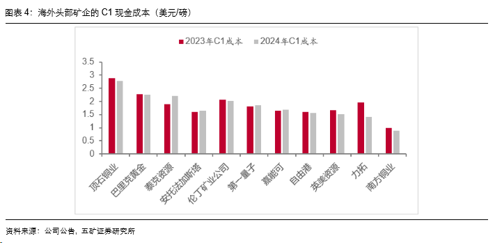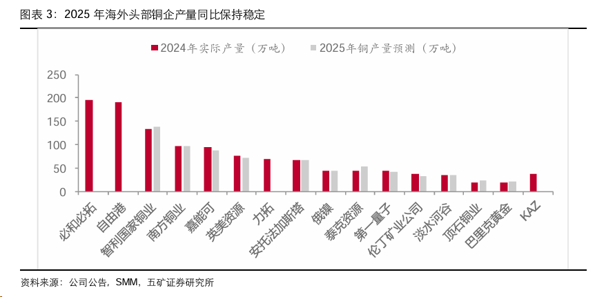 2024年海外样本铜企产量基本符合预期;C1成本大部分企业均有所下降,副产品收益、规模效应、管理层成本管控等为降本原因。2025年样本铜企产量较为稳定,给予铜价基本面支撑。