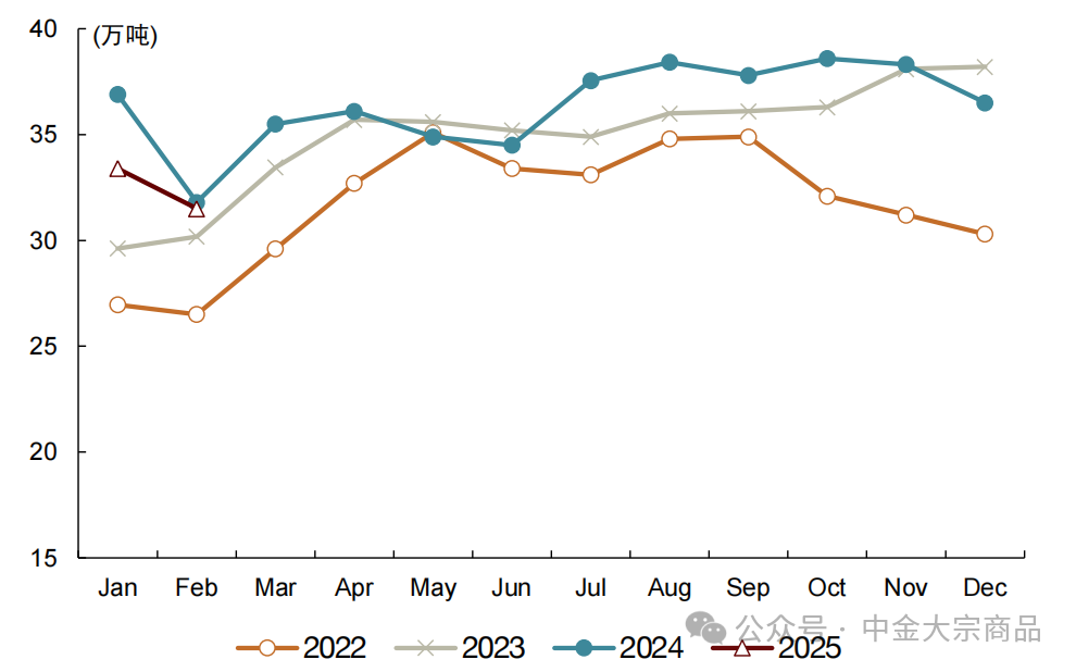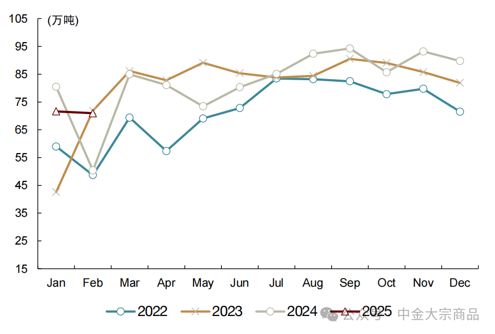 随着2025年21.25美元/吨的长单TC开始执行,中国冶炼厂的亏损压力进一步增加。但年初至今,新投项目爬产推动国内电解铜产量仍创下新高。SMM统计1-2月中国精炼铜产量207.2万吨,同比增长7.9%。我们在去年展望中分析了冶炼端供给韧性超预期的因素,主要包括1)废铜供应增长或部分缓解原料紧张压力;2)硫酸价格处于高位增厚利润;3)金属价格处于高位,超额回收收益与贵金属副产品收益均可观。