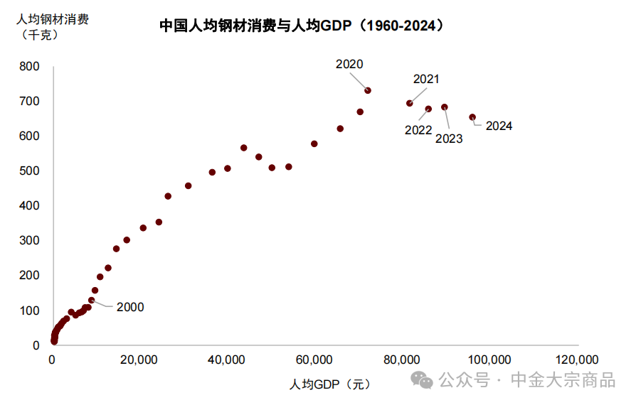 图表:中国人均钢材表观消费与人均GDP