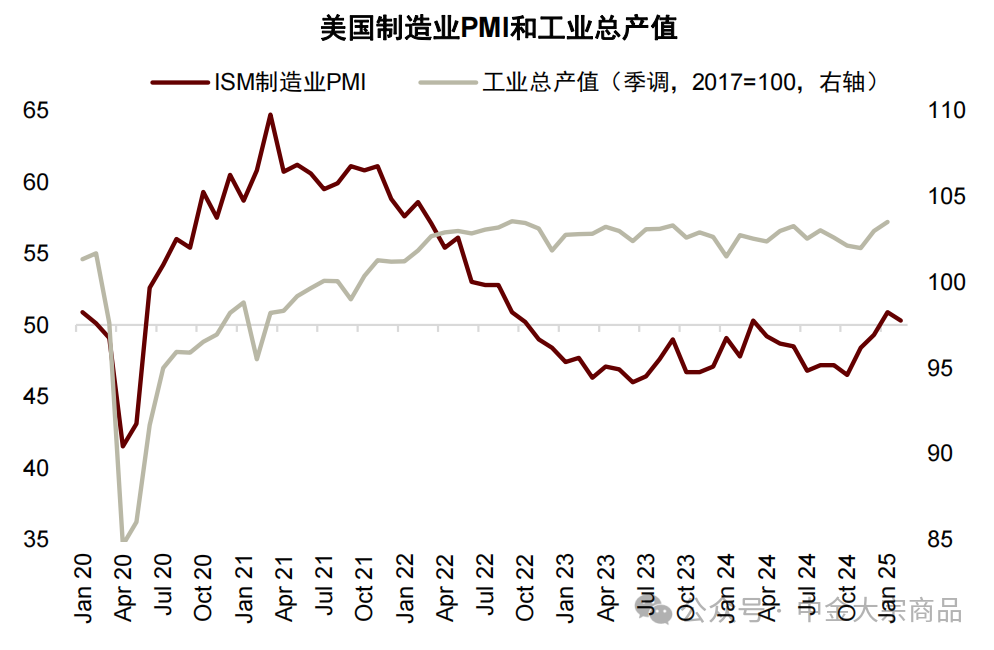 另一方面,美国经济前景以及利率路径的不确定性也在上升。今年以来美制造业回升迹象初显。今年前2个月美国ISM制造业PMI重回扩张区间,是去年3月以来首次。从中观数据看,金属制品和机械等终端金属消费行业的产出在边际上也有一定回升。地产方面,住宅投资和开工呈上升趋势。不过,制造业的整体景气度的回升尚未全面开启,且进入3月以来,美国就业、消费等数据显示整体宏观环境有降温迹象,高利率叠加关税扰动,美国经济的下行压力也有所加大,从制造业产能投资周期向生产补库周期的过渡可能并非一帆风顺。