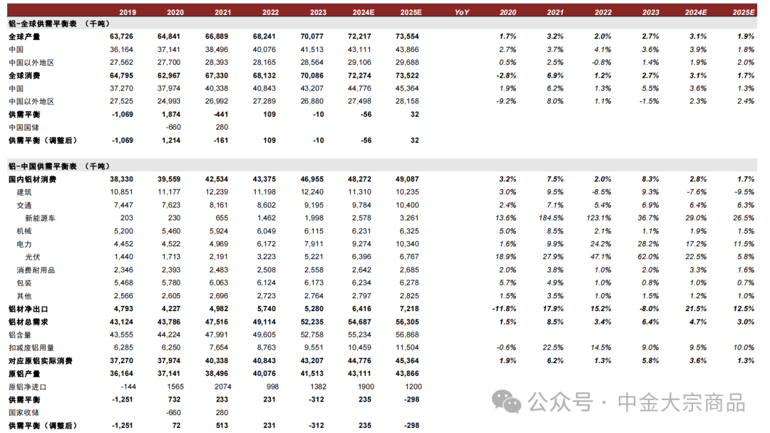 图表:全球电解铝供需平衡表2025E